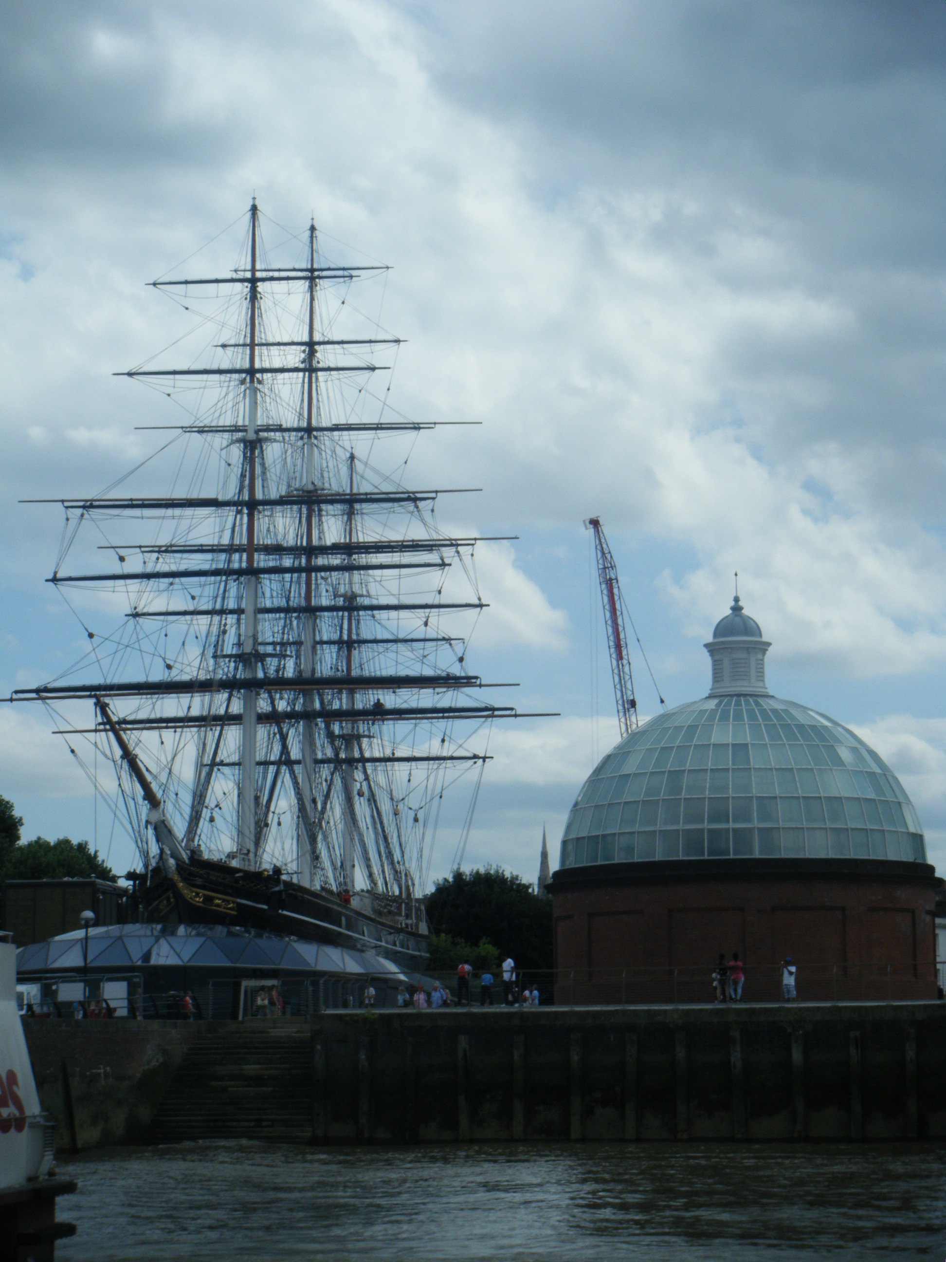 Until, there on the right, the palatial maritime buildings of Greenwich are heralded by the masts of the Cutty Sark rising from its glass display cabinet like a life-sized ship in a bottle.