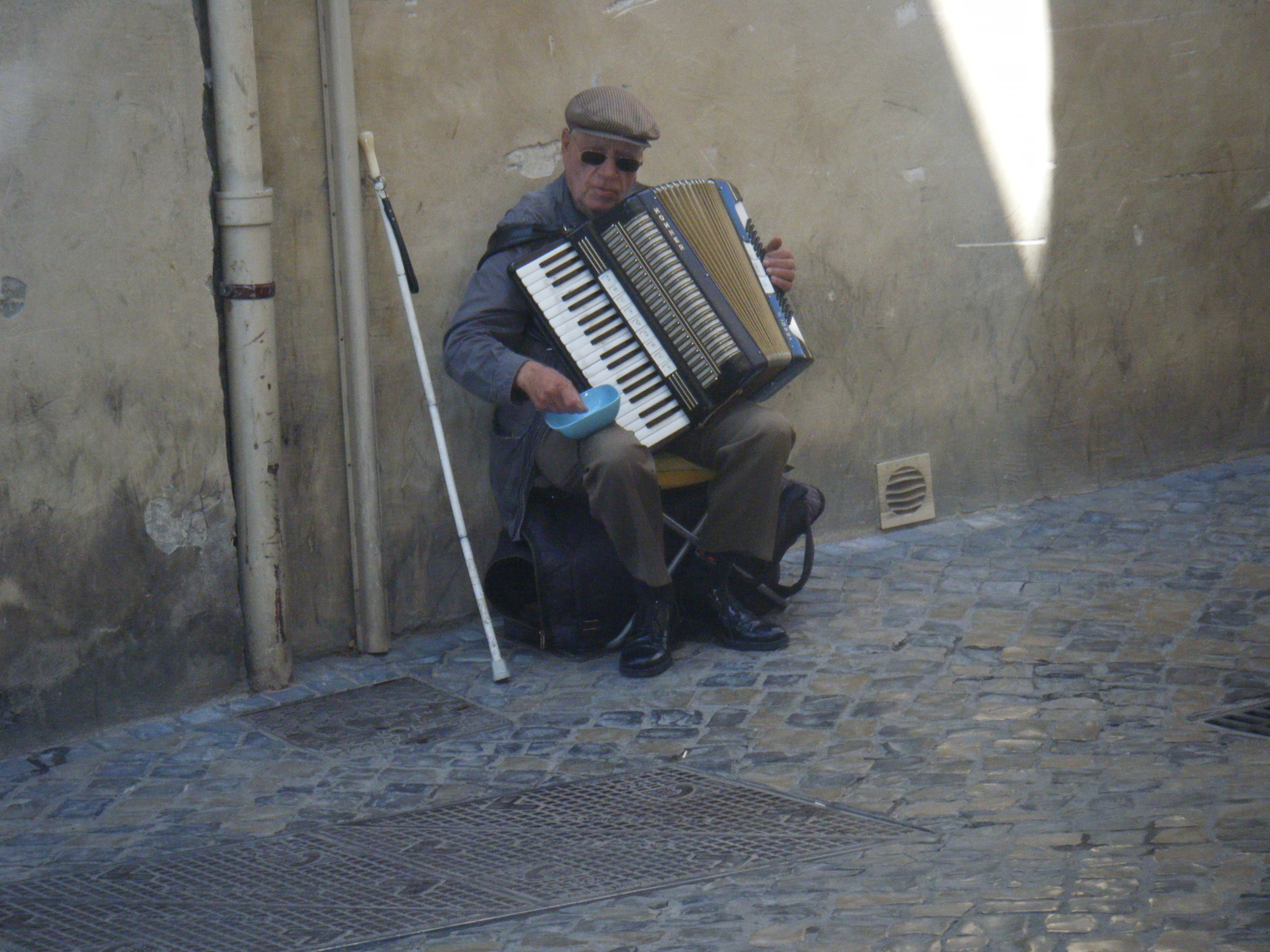 DSCF5253I have no idea where I’m going as the place is a veritable labyrinth of old, twisted streets and alleys. In one sense, Beaucaire, it seems, is very beautiful and exceptionally ancient – at least these back ways are. But it’s difficult to get a grip on things – no bars, no shops, no ateliers – just bend after empty bend until, around a corner, I come across an old blind man, sitting on the ground, playing his accordion. I take his picture but with cash in hand. He might not really be blind. That’s what Beaucaire does: it turns a disorientated tourist into a sceptical and untrusting being. As I walk over to place my money in the accordion player’s pot, I notice a pharmacy up a small incline into which I venture in search of more waterproof dressings for the wound which is now, like the old man of Aran, knitting nicely. It’s almost impossible to get into the pharmacy as it’s full to the brim with missing people. Perhaps they have Black Death here? The place is certainly old enough.