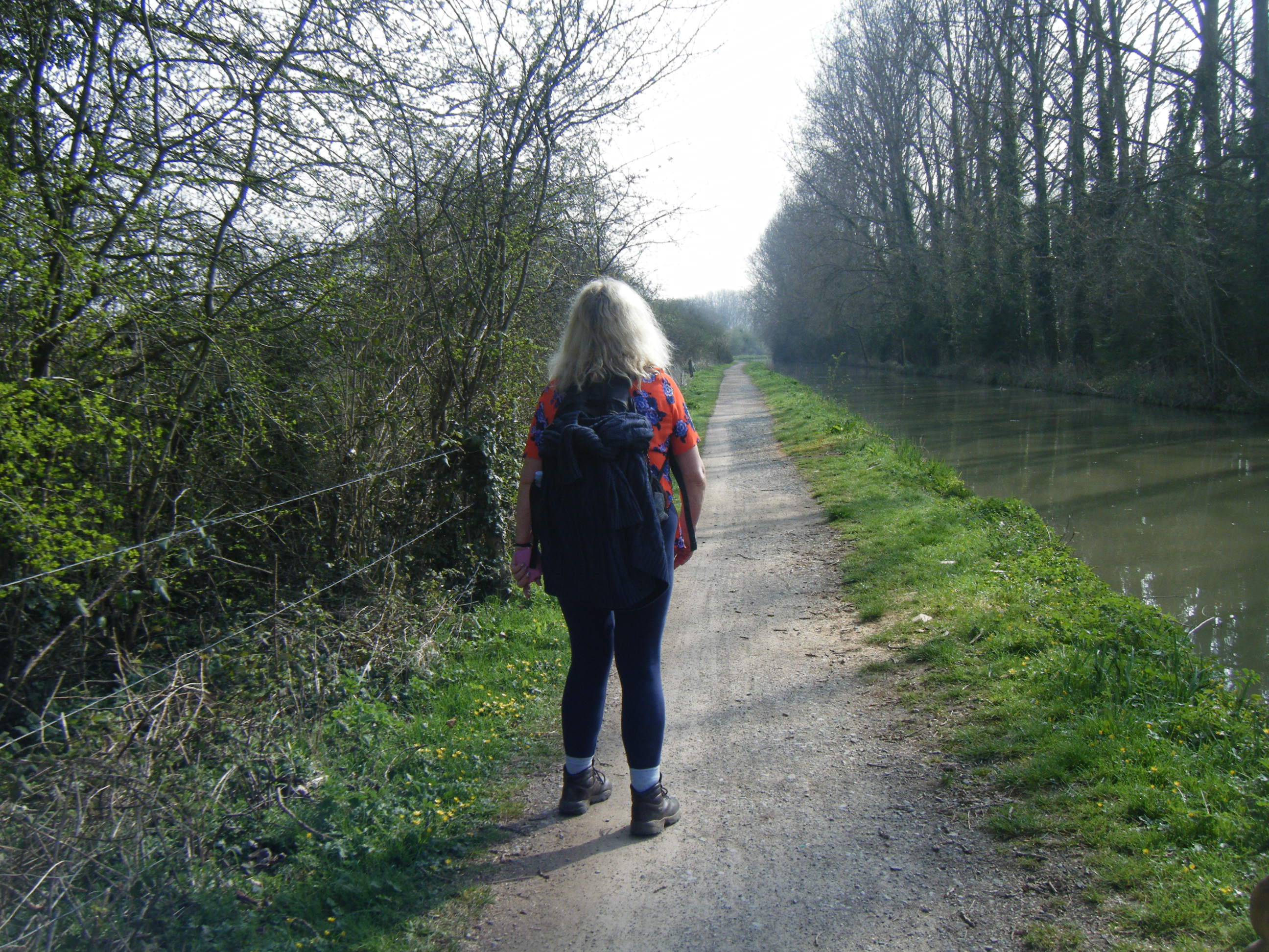 They are to accompany me for a short way along the tow path. The one who’s not on a diet has been poorly lately and managed to lose a stone in weight without trying, let alone giving up on bread. He thinks he might not be able to walk too far. As it happens, it’s such a glorious morning, filled to the brim with the goodness of warming sunshine, that they decide to continue beyond their planned stopping point. And once they get to the new destination, they carry on past there too. The poorly one hasn’t felt this good for months. We look over at Widbrook Woods which are relatively new and are currently boasting a spread of sheltered primroses. Then, overcome by the demands of their new roles as travelling companions, those two decide they’re in need of coffee.