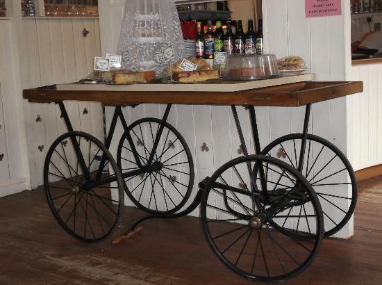 We take afternoon refreshment in the tea rooms at Moreton. Scones and cakes are not involved. He doesn’t want any and I am too fat; although I would’ve been sufficiently polite to join him had he shown an interest in patisserie. Now, I have to be gracious enough to hide the fact that I’m secretly sulking about the lack of sugar and cream. Instead, we discuss the contraption on which the delicious, but-never-to-be-consumed enticements are displayed. It’s a strange affair – four large wheels, an enormous length of wood, unexplained handles and so on.