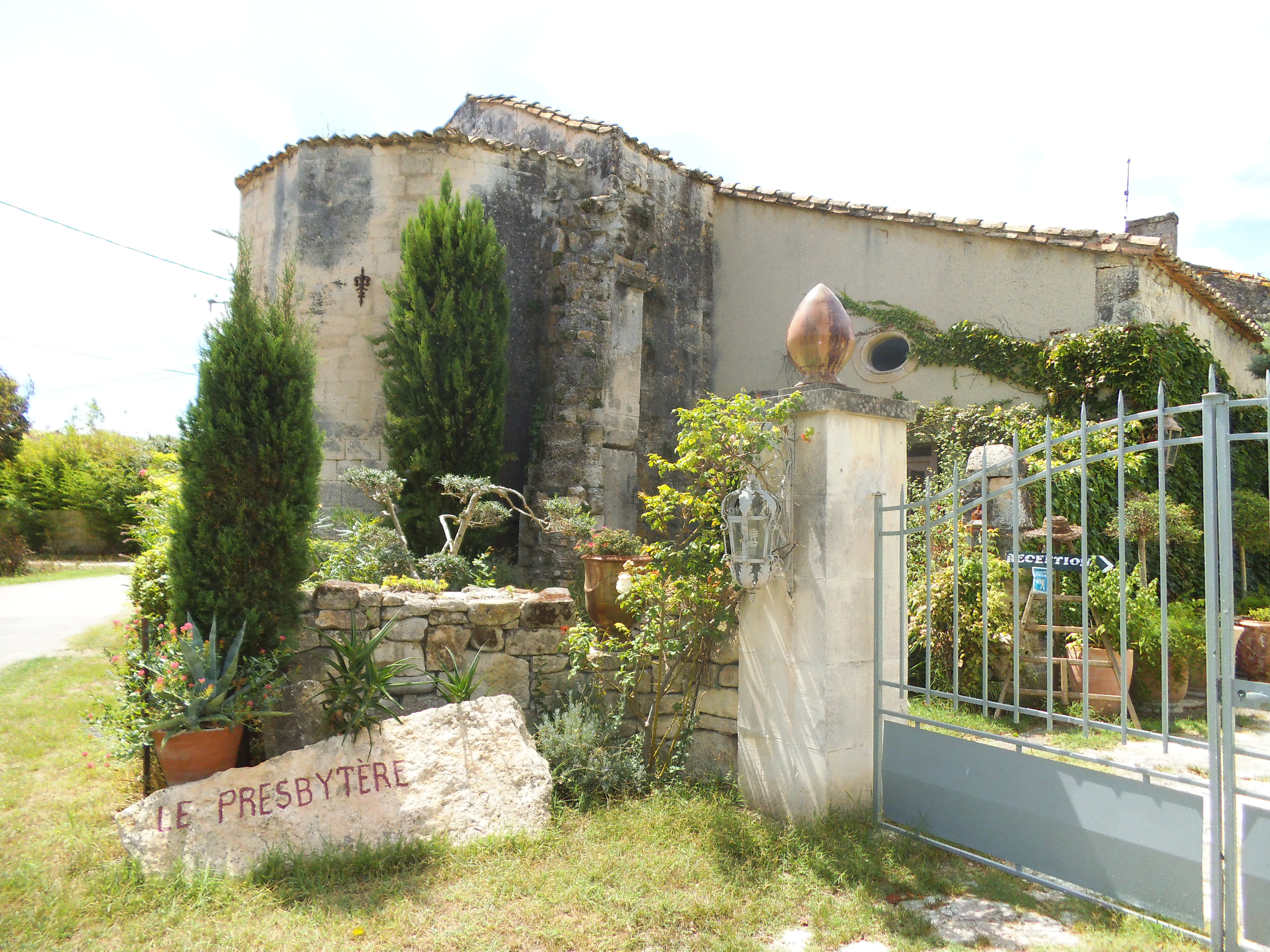 DSCF0531I want to go inside but when I get round the corner, it seems to have turned into a house called Le Presbytere. It has a charming garden and one of those cardboard arrows so loved by the French. This one says ‘reception’ so I enter and knock on the door. Marie answers. She looks cross. I ask whether she knows where La Mourgue is. ‘At the end of the road’, she replies. I ask whether the chapel is private. ‘Down the end of the road’, she replies. I hazard a guess that I might not be the first to end up in her garden asking these questions.