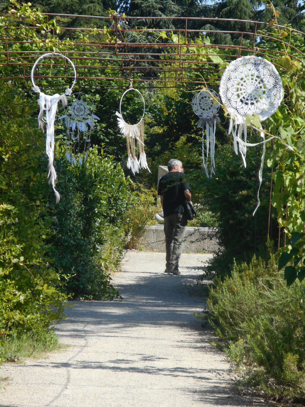 We seem to be passing along the Arles road so frequently these days that even my companion feels finally grounded so I make an unexpected left turn down the lane that leads to the perfume museum. Although I want to purchase some Eau de Violette, the main purpose of this detour is to visit the gardens which are cloaked in a myriad of bees and butterflies. It smells nice too. The place looks particularly lovely today as it’s still dressed in the dreamcatchers that were part of yesterday’s wedding decorations. We wander along, searching hopefully for Russell’s bride who, it seems, has already run away.