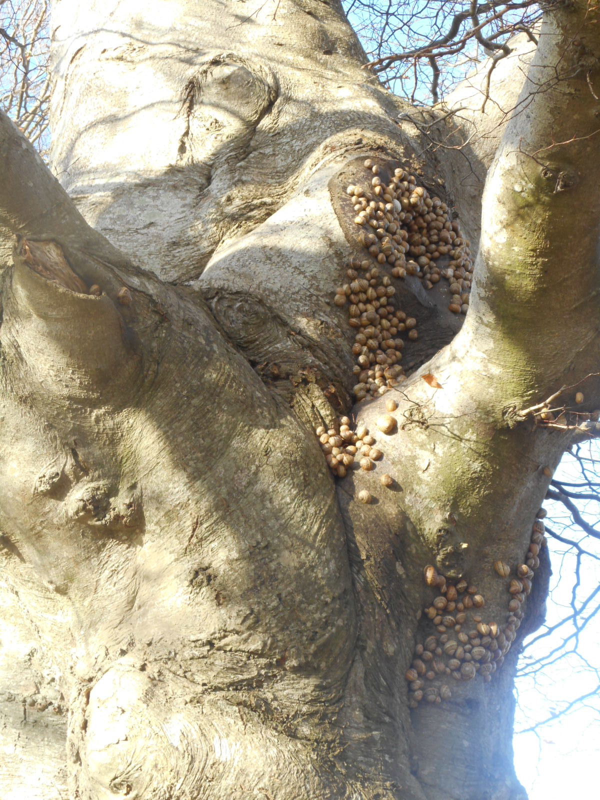 The beech tree avenue is two and a half miles long and was laid out in 1835 on the instructions of William Bankes, allegedly by French prisoners of war. But you don’t want to know that. What you and I want to know is what all these snails are doing up a tree. And I’m saying nothing about the shape of this tree.Tree snails live in tropical countries so that rules out that explanation. Snails like beech litter but all that stuff is down below so that’s also a non-starter. Unless, dear reader, you are the exception, no-one knows what snails are doing up trees. One thought is that they hibernate on the south side (and this is the south side) but why haven’t the birds had them?