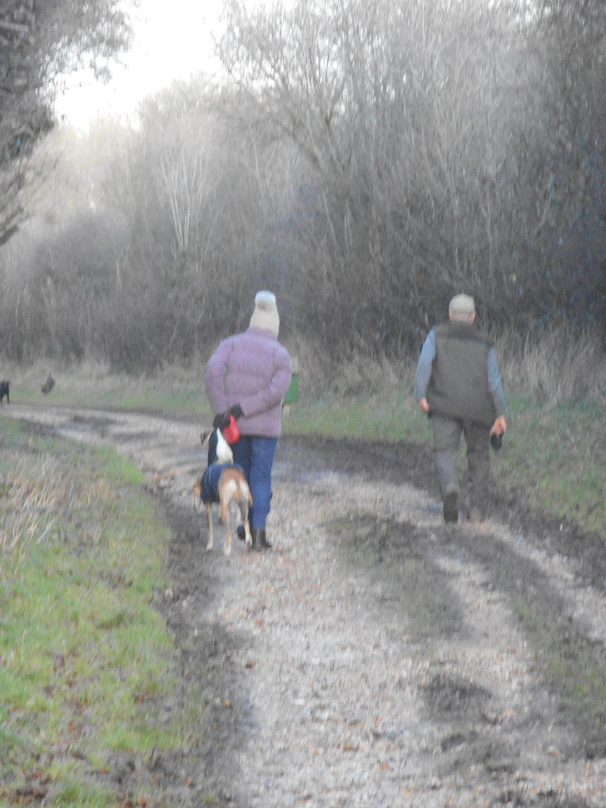 The sky darkens and the weather is on the change as I wend my way back down the hill. My last photo isn’t very clear but I wanted to include it as it shows Bertie. Bertie is a rescued greyhound from the Margaret Green Foundation. This is only his fourth day with his new owners, Michael and Anne. ‘Can I stroke him?’ I ask. ‘Well’, says Anne, ‘we don’t know what he’s like with strangers yet’. On this muddy Dorset path, Bertie leans against me lovingly. ‘He likes you’, says Michael. Of course he does.