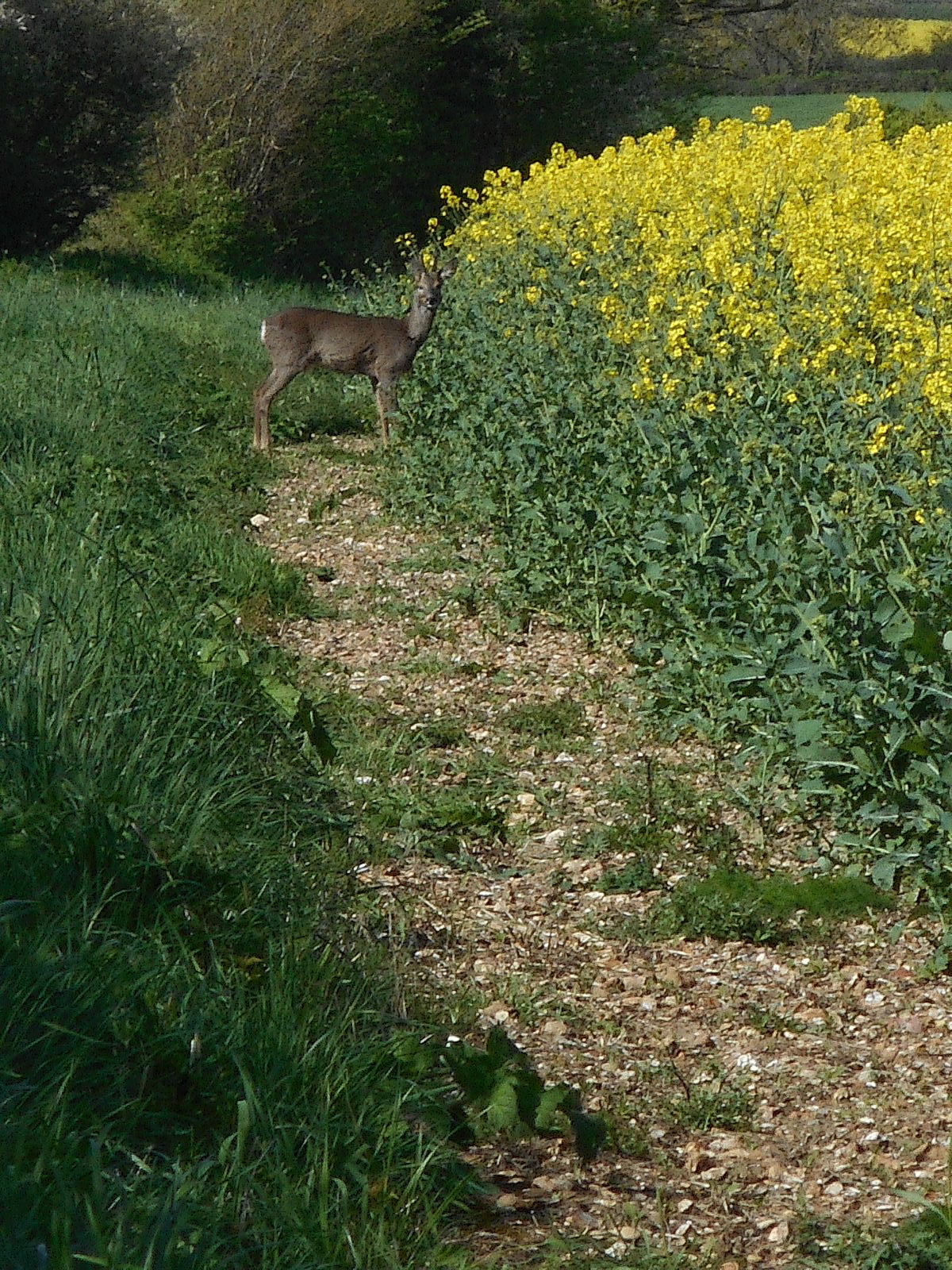 Not going down Park Lane means I’ve missed the attractively named Crab Farm plus a stroll down Half Mile Drove. Time was that I’d be excited by a drove. It’s true, I love the traditional ways but, seen one drove – you’ve seen them all and unless there’s the likelihood of spotting any rambling drovers well, I’ll give it a miss. In any case, had I not stopped to lean over a gate, as you do when rambling, I wouldn’t have seen the little deer wondering whether to venture into the rape seed oil field.