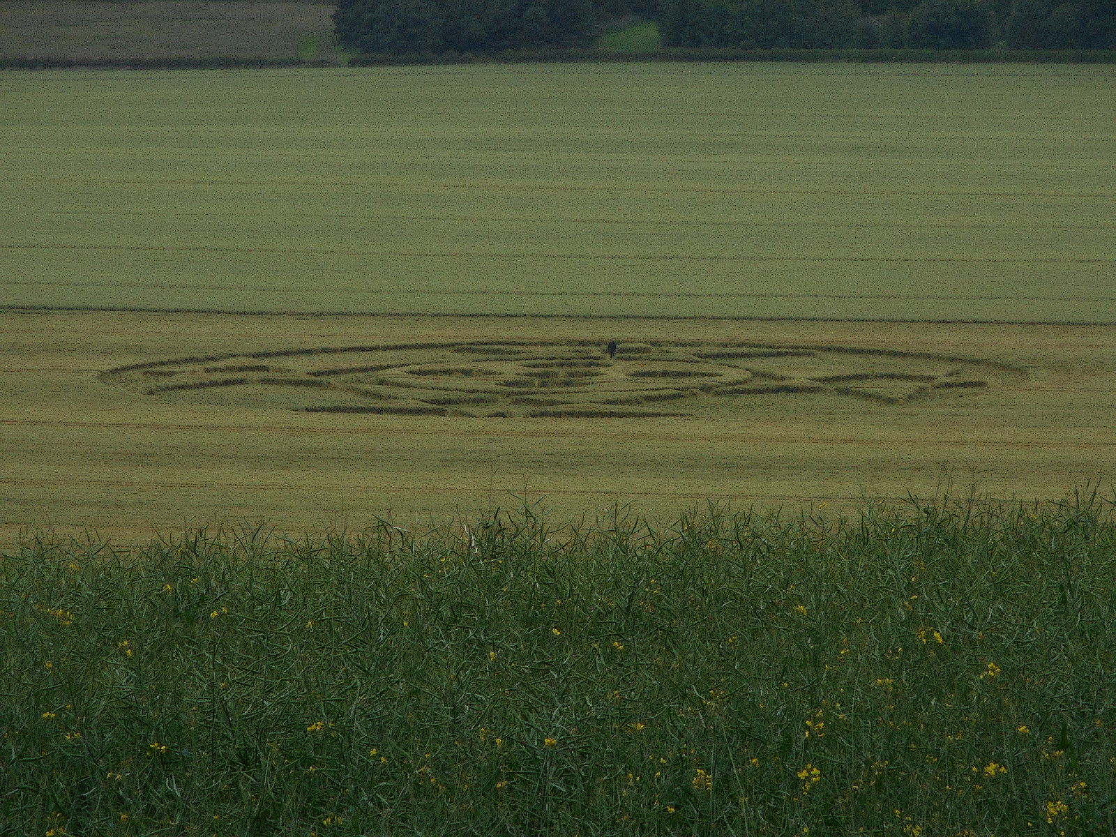 B and the pathfinder are striding on ahead. Pathfinder Powell, in charge of the map, informs us that three beech copses are imminent and B says she’ll pop into number three for a number one. I don’t much care for woods so the pathfinder and I hang about on the track whistling until B emerges with news of a crop circle below Hackpen Hill. We venture in and there it is.