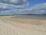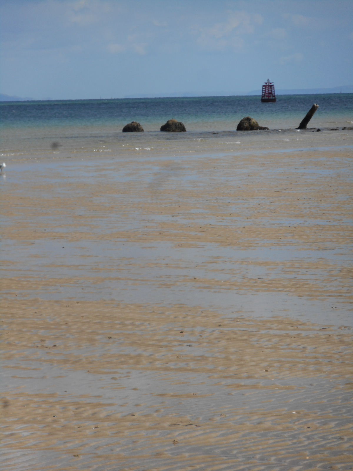 I round the headland and set off into Shell Bay. The tide has receded considerably and the insistent sunshine creates wonderful colours on the water.