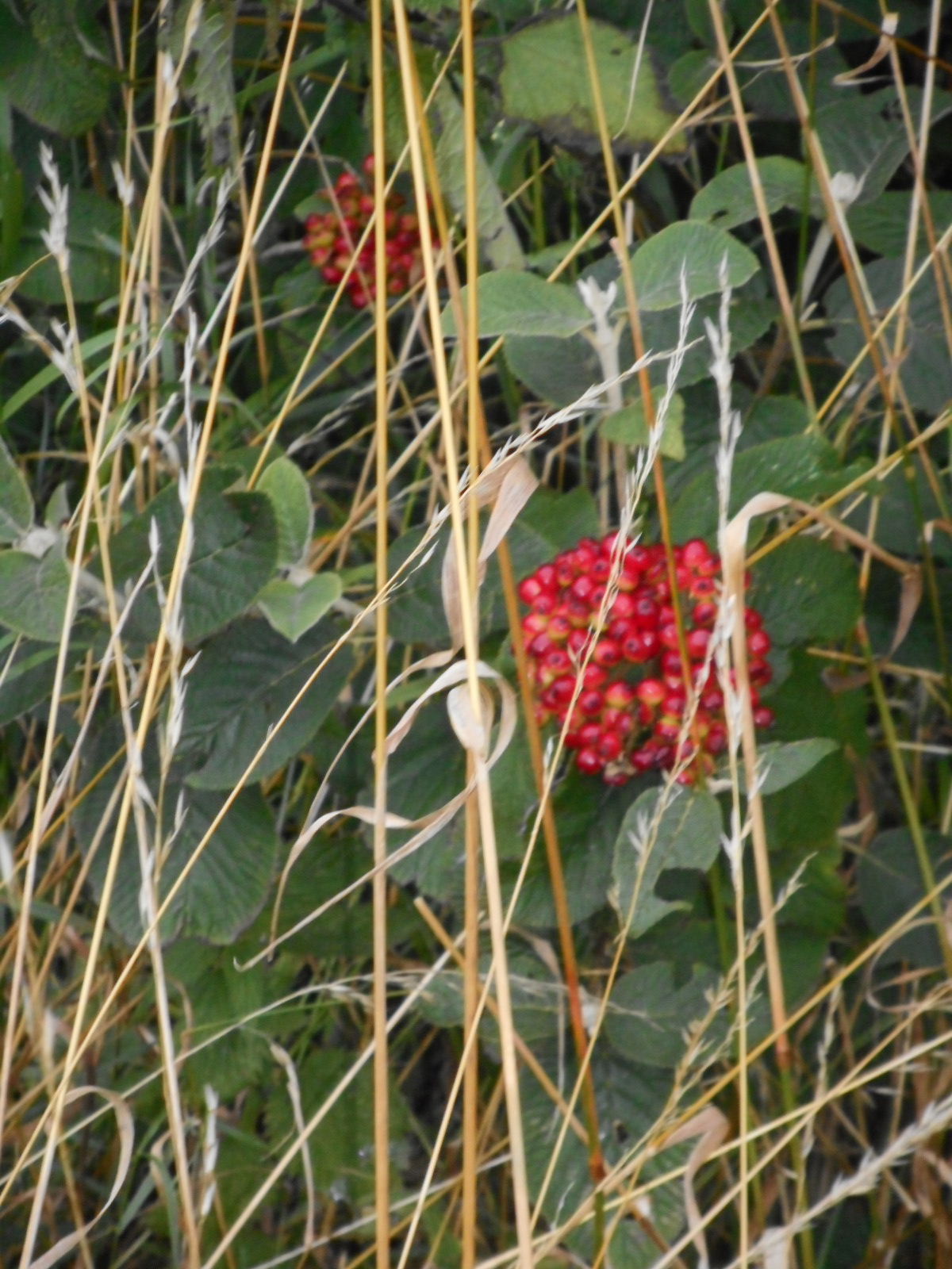 The other side of this evening’s path is banked by diverse hedgerow including the already sloe-laden blackthorn and naturally the talk turns to gin making, and to late summer foraging in preparation for yuletide gifts. There’s also a profusion of foliage bearing clusters of bright red berries which are so tightly packed that we confuse them for flowers at first. This is the aptly named Wayfaring Tree. I love that, for what are we but temporal wayfarers along this track?