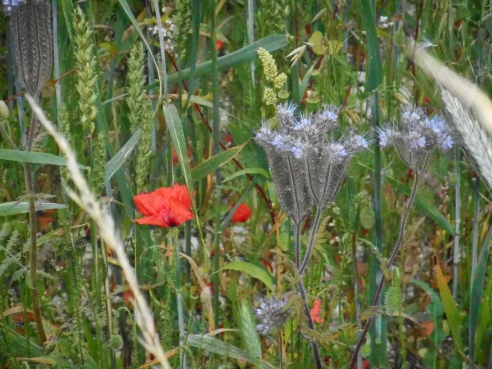 A few spit-spots of rain are felt and as we turn to walk away from the enclosure, we notice that the hills, which were so sharply defined only ten minutes ago, are already shrouded in unseemly weather. Passing poppies, scabious and beautiful unidentifiable purple flowers, we walk a little more quickly now down to the farm buildings and onto a delightful back path into the village of Avebury. In this lane, the homes are so affluent that even the walls are thatched. The weather finally closes in and just as we reach our transport, the rain begins to fall relentlessly.