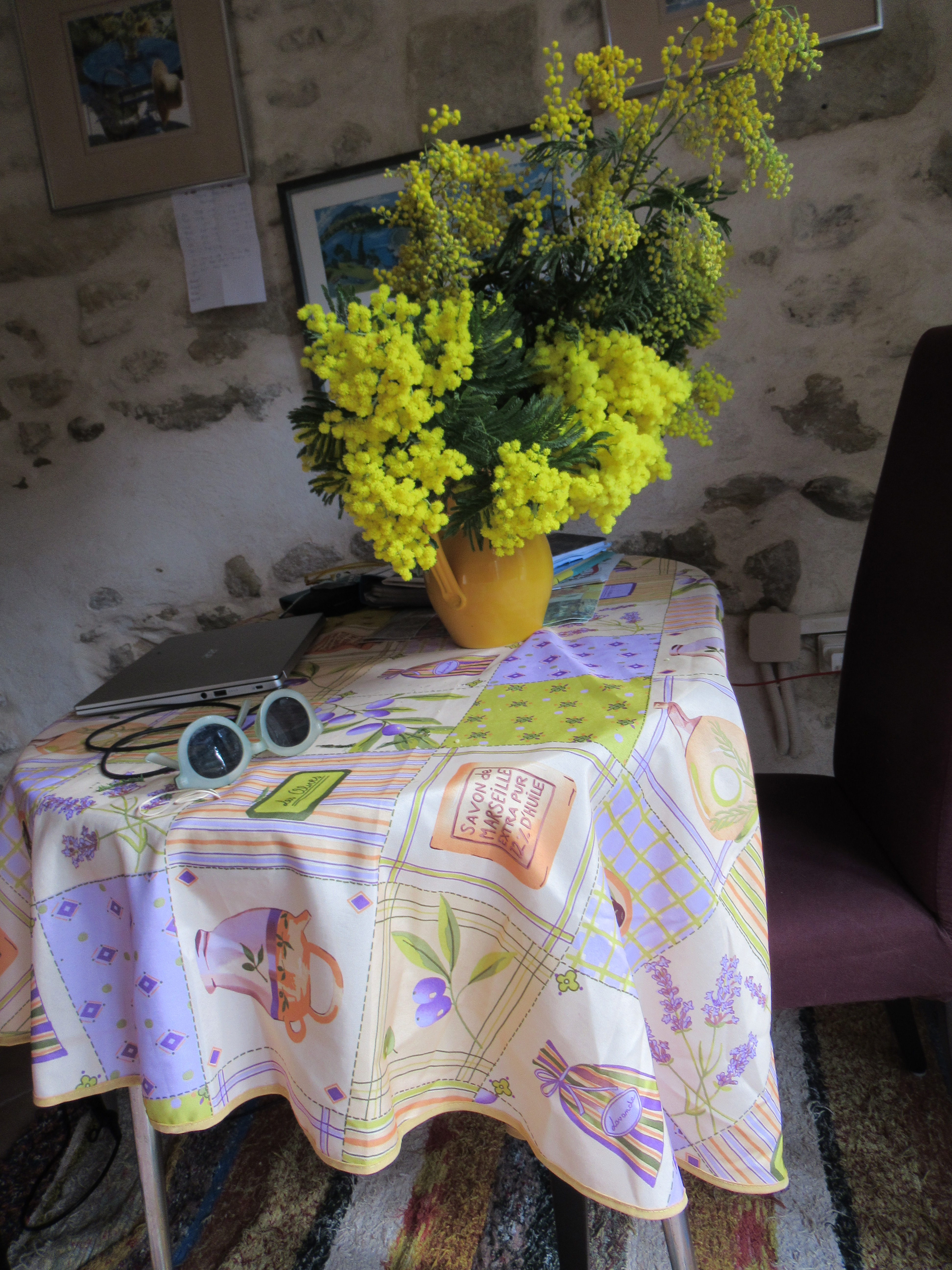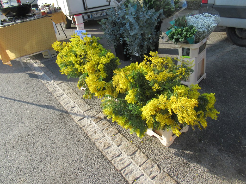 It’s Friday and I’ve come because it’s market day and this is one of my favourite markets in the summer. However, this being the beginning of February, the market is tiny. But – this being February, there is mimosa. The first time I saw mimosa growing in Provence as I was driving along, fourteen years ago, I screeched to a halt. It’s just the most wonderful thing to come unexpectedly across a bush of sunshine. Even the hardened locals are making a purchase today and I buy a couple of bunches for myself and my host.