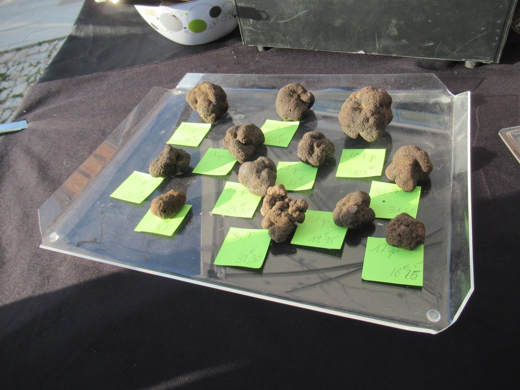 And there are truffles. I’m not about to make a purchase on this stall as I wouldn’t know how to make good use of them. Monsieur and I have a conversation about possibilities and even though he’s aware it’s a non-starter, he still proudly removes the cover so I can take a snap.