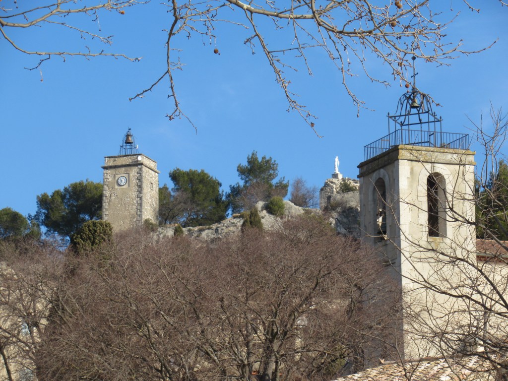 High above Eygalieres, sit a selection of interesting historical buildings. For example, that white thing is the almost obligatory statue of Mary. Generally, when I visit this village, I wander on up to inspect the architectural heritage and the amazing views over the surrounding countryside. Not today though. Don’t be swayed by those azure skies, lit by glorious sunshine: it’s freezing. After the heady warmth yesterday, the temperature has dropped to glacial depths.