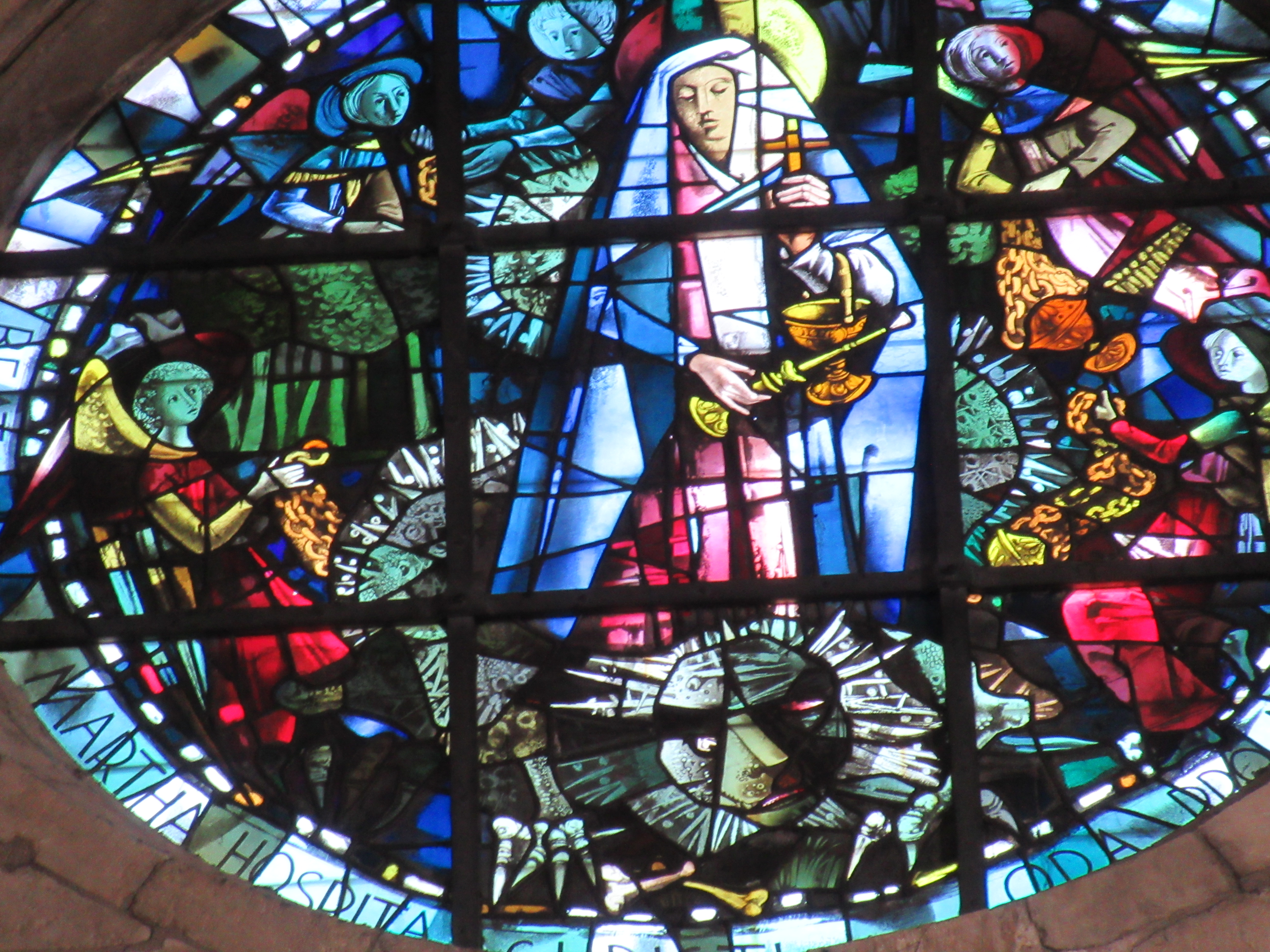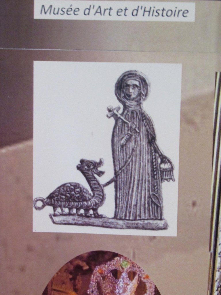 Finally, it’s not immediately obvious in this church where, amongst all the usual statues, sculptures and paintings, any depiction of Martha might be. I’d do well to follow my own advice when on a walk or a visit anywhere: Look UP. And as I was leaving, along an aisle that I’d already traversed, way up in the vaults, I finally saw this glorious piece of stained glass. There’s our dear brave Martha, and at her feet the fearsome Tarasque.