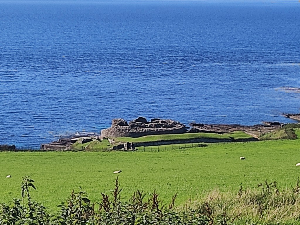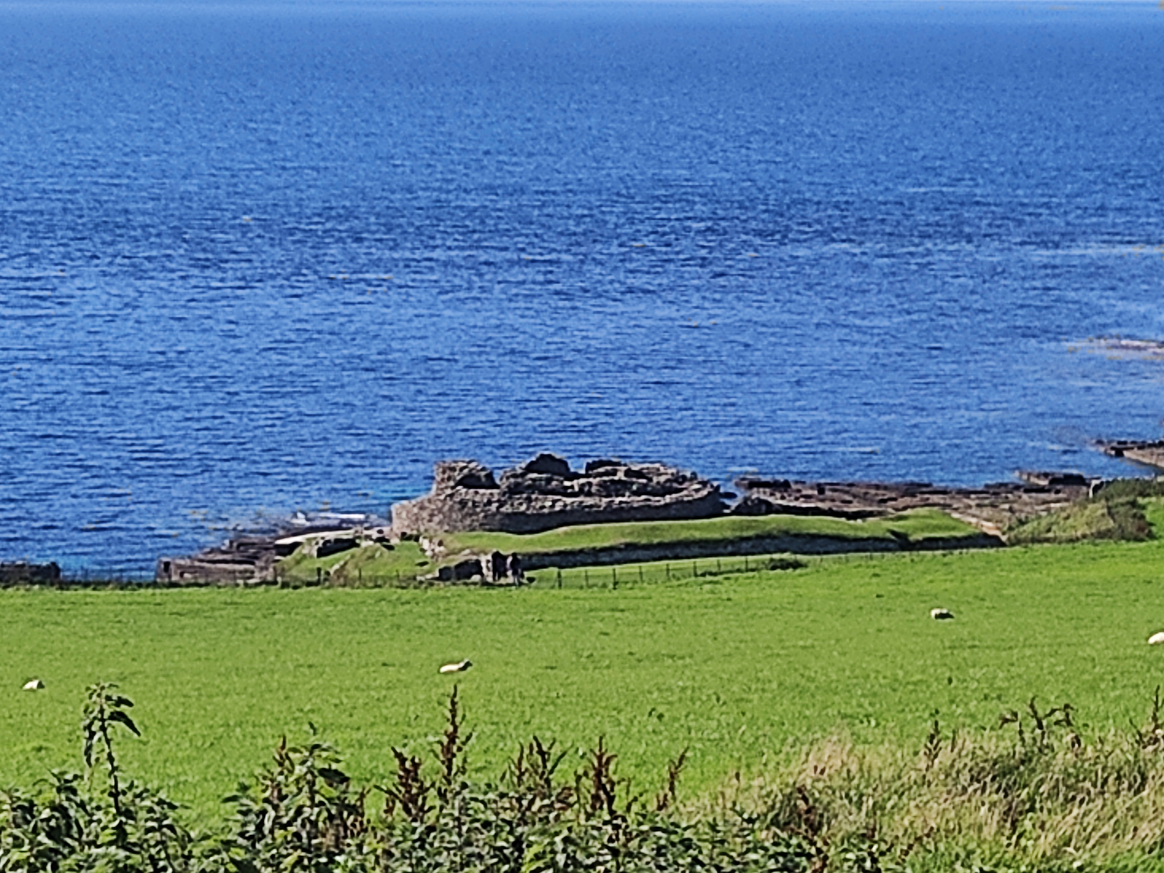 Coming down that huge hill was bad enough, the thought of going back up looks downright/upright scary. Walk in zig zags advises our guide; a man who hasn’t noticed that those of advanced years with a predilection for red wine always stumble along in this manner, even when traversing the high street in town. The sunshine is glorious. Had it not been so, I’d be sitting in the minibus for the duration of the visit to Midhowe tomb and broch.