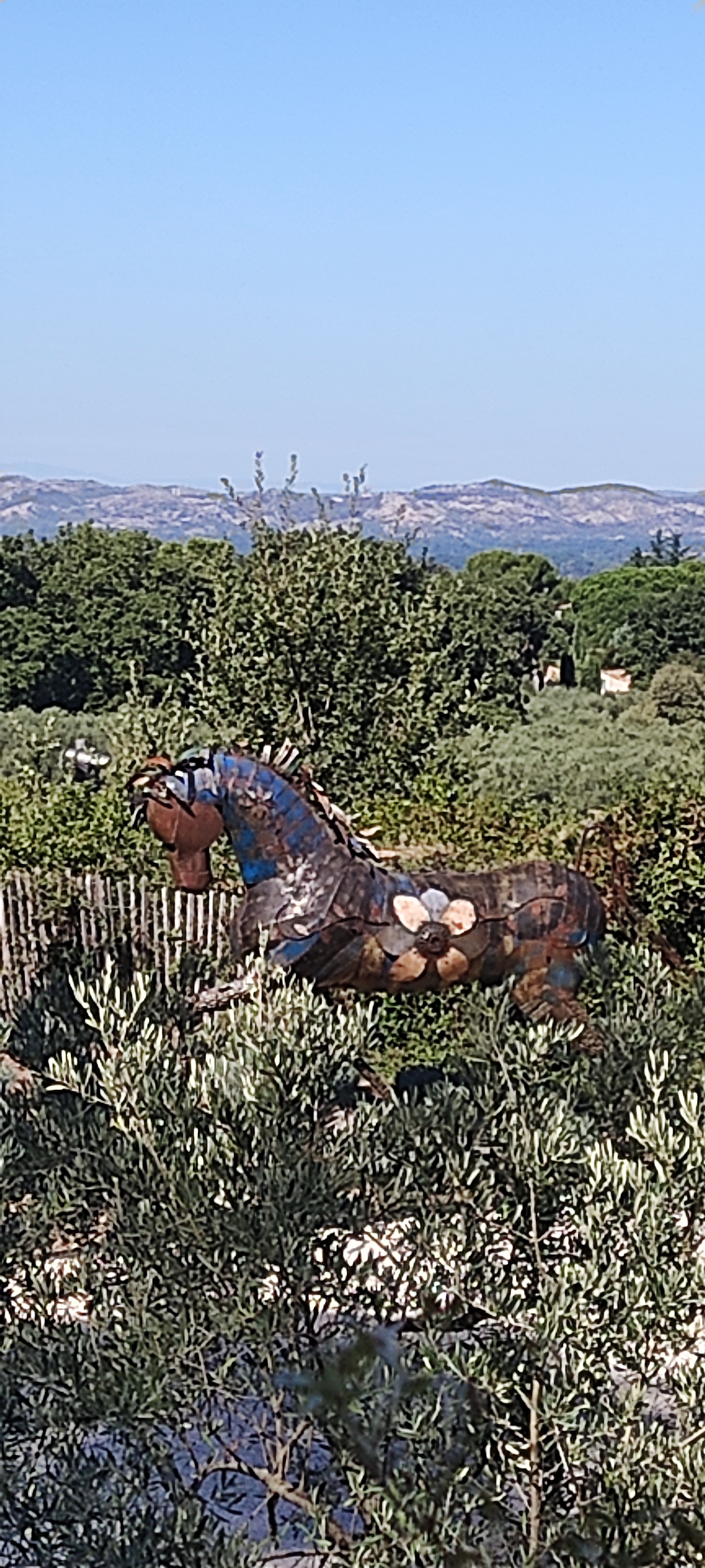 Further along the way, and I’m out in the open now on the foothills of Les Alpilles with spectacular views of La Montagnette and Mount Ventoux. The latter is famous in the wider world for being a particularly high point up which sturdy cyclists in the Tour de France sometimes wander. In the past, those on bicycles weren’t so healthy; often stopping for a quick cognac to wash down their amphetimines, thus giving a different understanding to the concept of speed. I’m actually above the Domaine de Metifiot which is looking splendid in the midday sun. Look at this fellow: