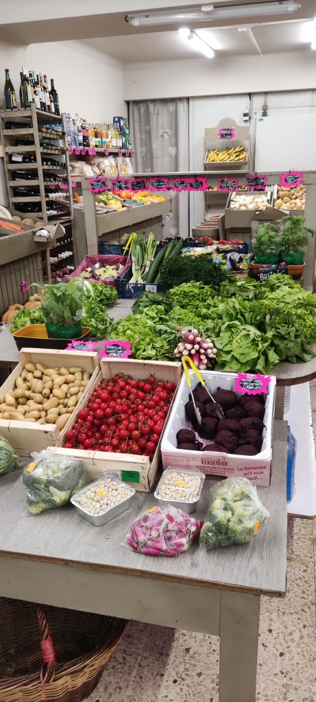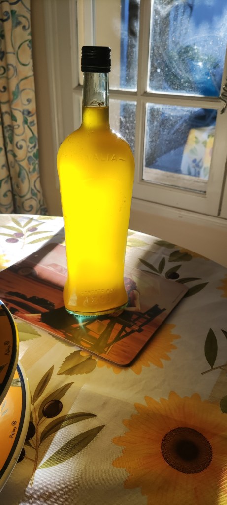Chez Florence is a little different in that one can find a veritable melange of fruit, vegetables, wine, cheeses and home-made meals, all of the highest quality. Today, for example, whilst searching for olive oil, she presented me with an old Martini bottle containing an interesting looking, if slightly cloudy conncotion which she’d made herself over in the Gard.