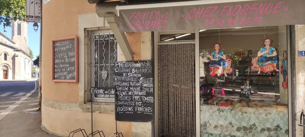 On the corner of the main street in our village, which is pretty much the only street, we find Chez Florence. It seems to me that Florence has been there forever: certainly, when I first found Rognonas towards the end of 2007 she was present and has been ever since; with the exception of high days, holidays and holy days of which, this being France, there are many. It was only in July just gone, however, that I discovered that Florence lives in Nimes which is probably an hour’s drive away for most people and around two weeks for yours truly – a tediously slow snail behind the French wheel.