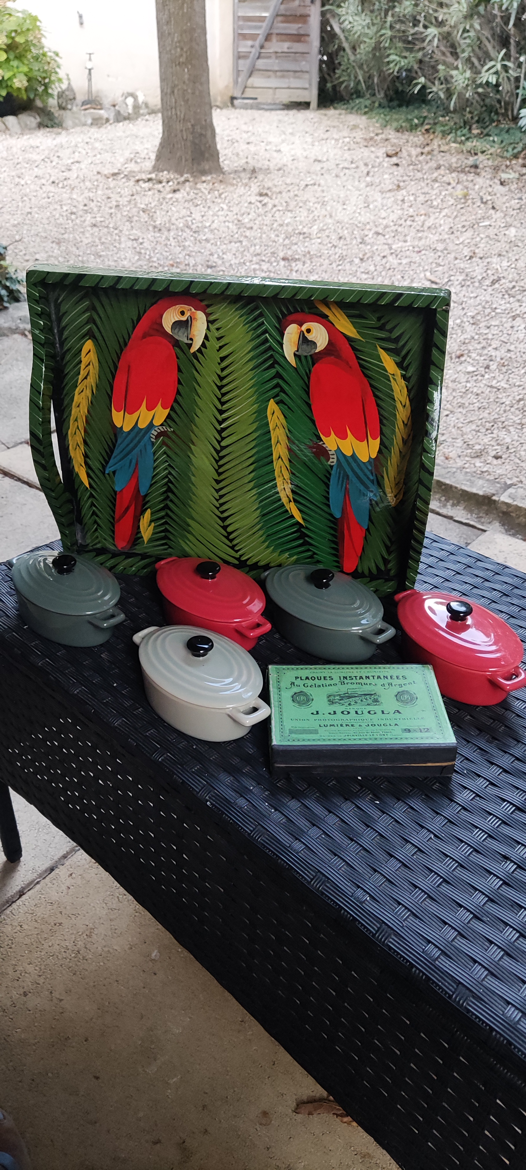 Here’s a few of my super cheap purchases. Those tiny dishes are Le Creuset, ideal for posh starters. Not saying how little I paid in case they appear in someone’s Christmas stocking. Want to know what’s in that green box?