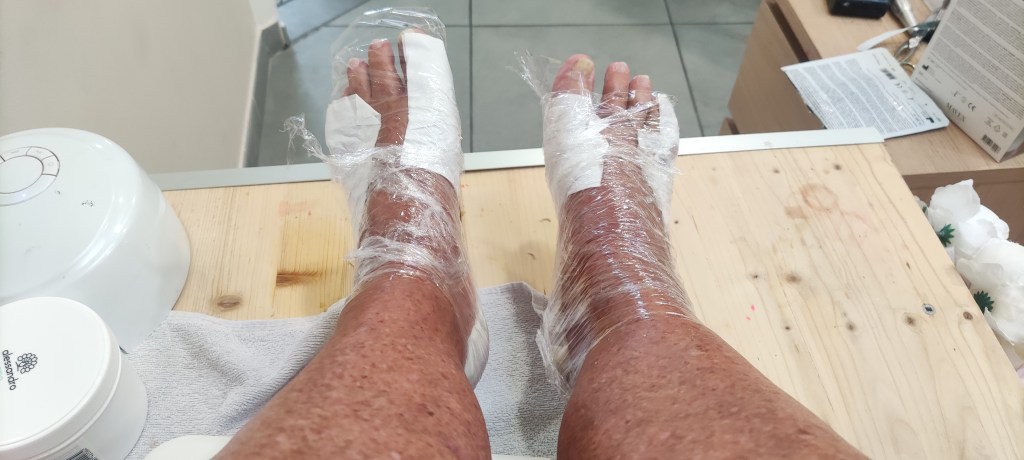 There followed an exfoliation which was pretty effective – feet felt like those of a new-born. But, I thought, pretty damn speedy. Helen would be massaging my legs by now. But, Helen wouldn’t then have produced a roll of cling film. Camille unwrapped some of those hydrating sheets, normally worn on the face, and wrapped them around my soles and toes before encasing my feet in the cling film. And before disappearing. I sat alone on my throne wondering what was happening.