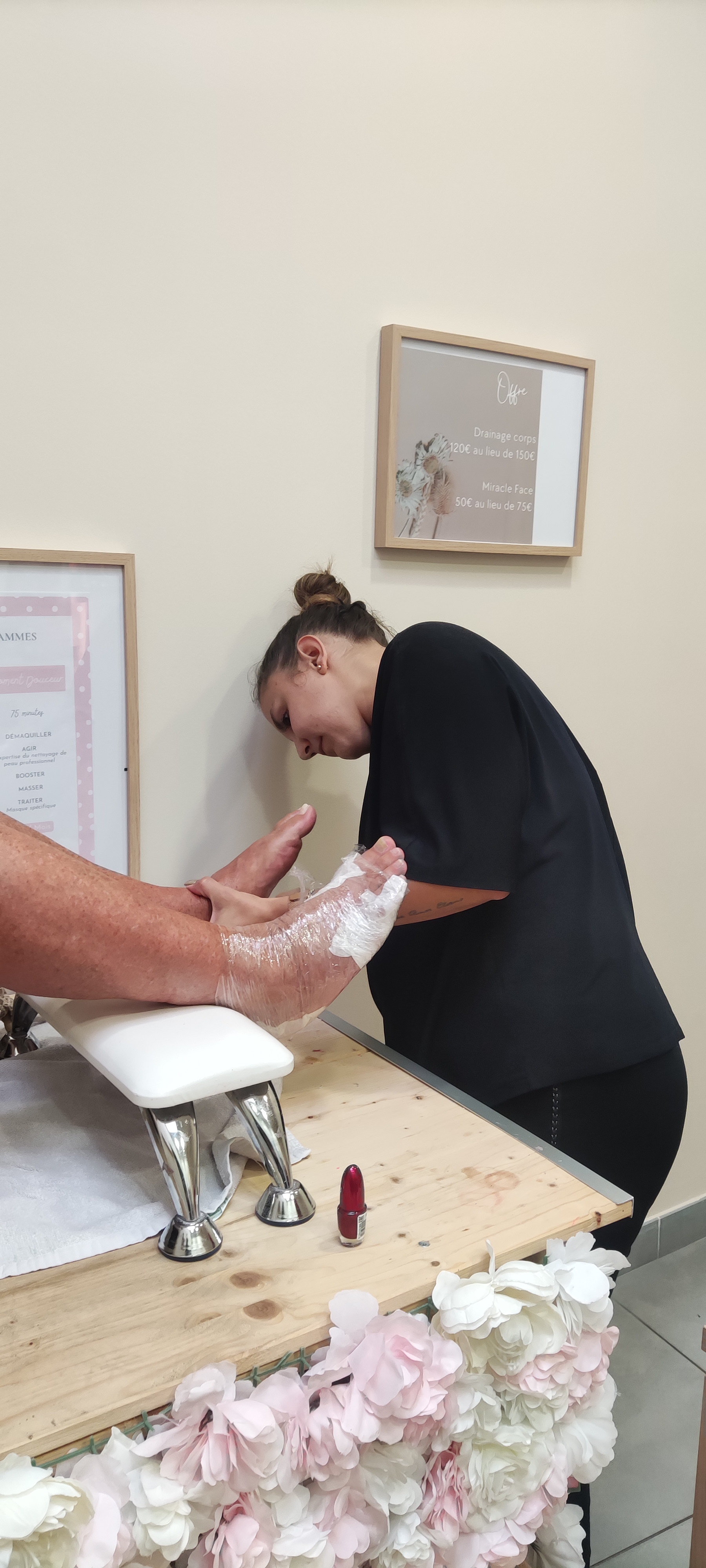 Eventually, Camille returned, possibly from a rendezvous with her boyfriend. Washed and creamed my feet and applied the chosen colour.