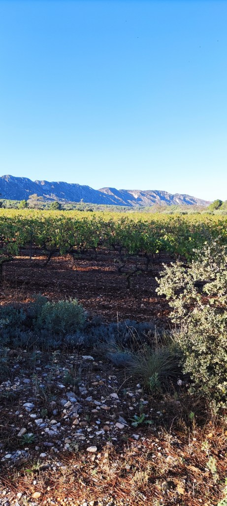 And we’re off, traipsing around vineyards that produce award-winning wine at the foot of the Alpilles. Beaucoup des brownie points for providing a view. I know you don’t like hill walking, she says, so I thought of a walk that woud be flat for you. She’s so kind: will you be ok in those shoes, she asks, inspecting my Clarkes sandals which allow an appealing view of the toes Madame painted the other day? It’s all I have, I tell her. I could mention that I also possess a pair of flip flops, but who knows what that translates as so I keep this information to myself. Anais tells me about the wine and I tell her that, when I’m here, I only buy wine that’s been awarded a medal by some committee or other, and has been bottled by the proprietor of some joint or other. The former condition is pure snobbery on my part; the latter is something I learned some years ago – if it’s not made where the grape is grown, then it’s a mixture.